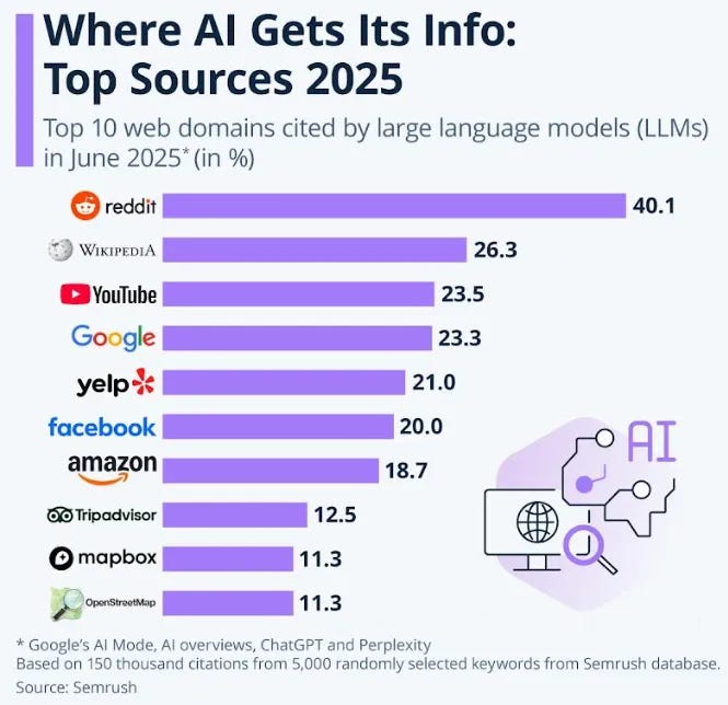 “Are we in a phase where investors as a whole are overexcited about AI? My opinion is yes. Is AI the most important thing to happen in a very long time? My opinion is also yes,” he’s quoted as saying. Alibaba co-founder Joe Tsai, Bridgewater Associates’ Ray Dalio, and Apollo Global Management chief economist Torsten Slok have all raised similar warnings. Another article outlines the poor returns of AI investments for most companies. In recent days, tech has lost $1 trillion (prior to Powell’s comments Friday). Reuters has a similar article. On a related note, I thought the chart of where AI sources its data was a bit concerning. Crazy story how AI models are blackmailing to get what they want.