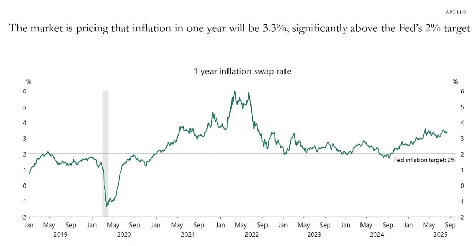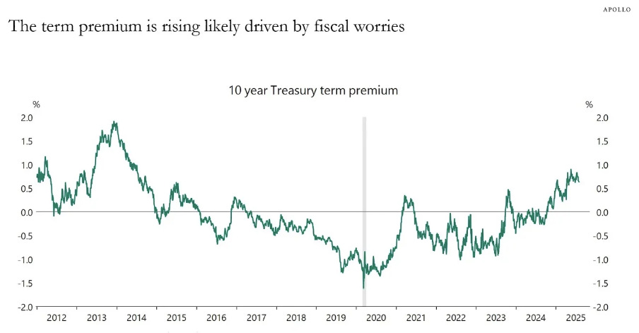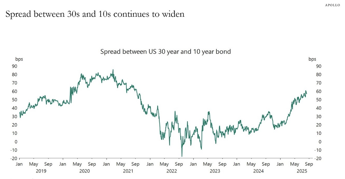 The yield curve is steepening, and Apollo’s Torsten Slok discusses it in this short note. The US yield curve has started steepening, not only 2s10s but also 10s30s, see the first chart below. 2s10s was 2bps in December 2024 and now 58bps. There are three reasons why this is happening:
