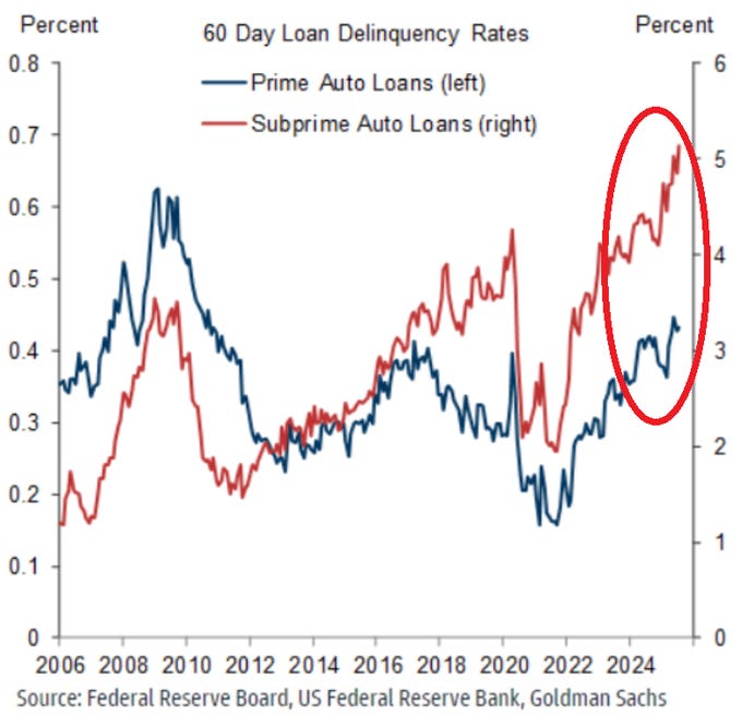 The 60-day delinquency rate for subprime auto loans has surpassed 5% for the first time in HISTORY. They have DOUBLED over the last 4 years. They are way ABOVE the Great Financial Crisis levels. Higher costs for cars, higher rates, longer loan terms create negative equity, inflation, and the end of the student loan payment moratorium all factor into the higher delinquency rates.