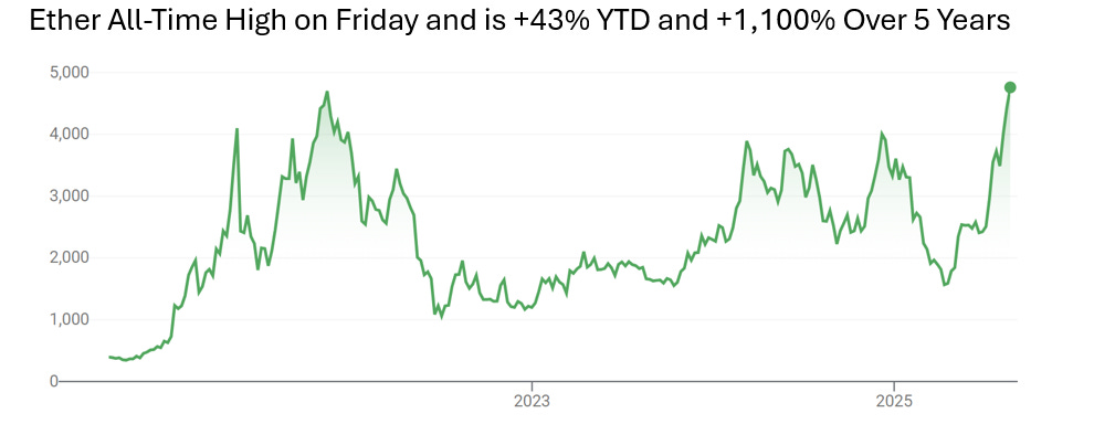 Thursday was the fifth straight losing day for the S&P, as some tech was under pressure and WMT dropped 4%+ after the retailer missed on earnings. However, Powell’s speech suggested conditions “may warrant” interest rate cuts and markets soared post the comments on Friday. In a tepid speech at the central bank’s annual conclave in Jackson Hole, Powell said that “the baseline outlook and the shifting balance of risks may warrant adjusting our policy stance.” The Fed chief added that “the balance of risks appear to be shifting” between the central bank’s dual mandate of full employment and stable prices. Full speech can be found here and he did say, “The effects of tariffs on consumer prices are now clearly visible. We expect those effects to accumulate over coming months, with high uncertainty about timing and amounts.” After the speech, the Dow was +1.9%, S&P +1.5% and Nasdaq+1.9%. Of note, the Russell 2000 massively outperformed at +3.9% on Friday alone. On the week, the S&P was +.3% and the Nasdaq was-.6%. The likelihood of a 25bps September cut was 91% post the comments. Treasuries rallied, with the 10-year -8bps to 4.26% and the 30-yeaar -5bps to 4.88% after Powell’s remarks. Although I believe a 25bps cut is now the right call, I remain concerned about inflation the 2nd half of the year with the impact of the tariffs and Powell’s comments did nothing to reduce those concerns. Interestingly, Ether notched its first new record in 5 years hitting $4.9k (+15% Friday), while BTC remains at $117k.