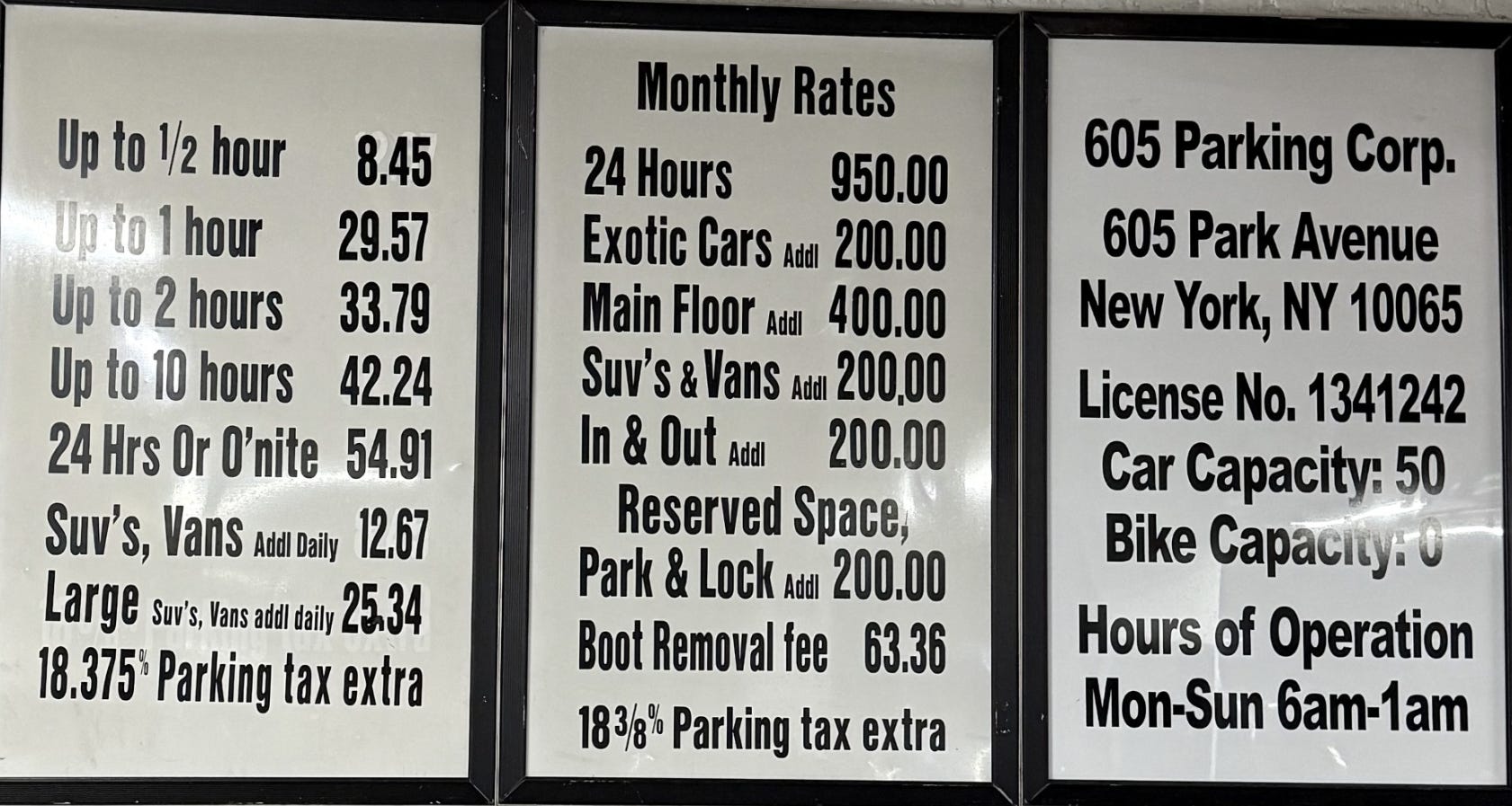 I lived in NYC for almost 25 years and was ashamed of the cost of living, which was one of the reasons I “escaped” eight years ago. I was in NYC two weeks ago and used SpotHero to find overnight parking on the Upper East Side at a large discount. I found a lot on 65th just off Park for $31 using the app. Had I not used the app, it would have cost me $54.91+12.67 (SUV charge), +18.375% tax for a total of $80 for 12 hours. Wait, you want to park for the month with an SUV? It will be $950+200 (SUV charge)+200 (in & out charge) +18.375% for a total of $1,598. This does not include the tip or “Holiday Bonus.” By the time you are done, you will spend almost $1,700/month to park your car. I am sick of people telling me that South Florida is more expensive than NYC.