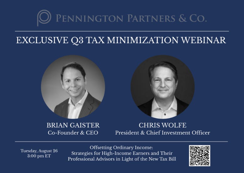 I am on the advisory board of Pennington Partners (multifamily office), and they are having an informative discussion on thoughtful tax minimization strategies that offset ordinary income under the new tax bill. I am able to offer the webinar to my readers. I feel Pennington does a great job of being creative on tax solutions and am sure this discussion will be helpful.