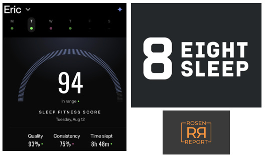 I have often written about my Eight Sleep pod and how it has improved the quality of my sleep. I had been travelling for almost three months, and my sleep had deteriorated dramatically without Eight Sleep. I came back last Tuesday night, and the result was an amazing night’s sleep. The ability to control the temperature (my side is set to 67 degrees) makes it a game-changer for me. This summer, I was sleeping less than 7 hours/night. As you can see below, I was closer to 9 hours on my first night in my own bed. My wife bragged about how much better she sleeps using the Eight Sleep Pod and has seen a sharp improvement in her sleep quality since she returned home. If you use the code: ROSEN, you get up to $350 off your purchase. Interestingly, Eight Sleep just raised $100mm from major investors to continue to improve the product and integrate software and AI to track and enhance sleep quality.