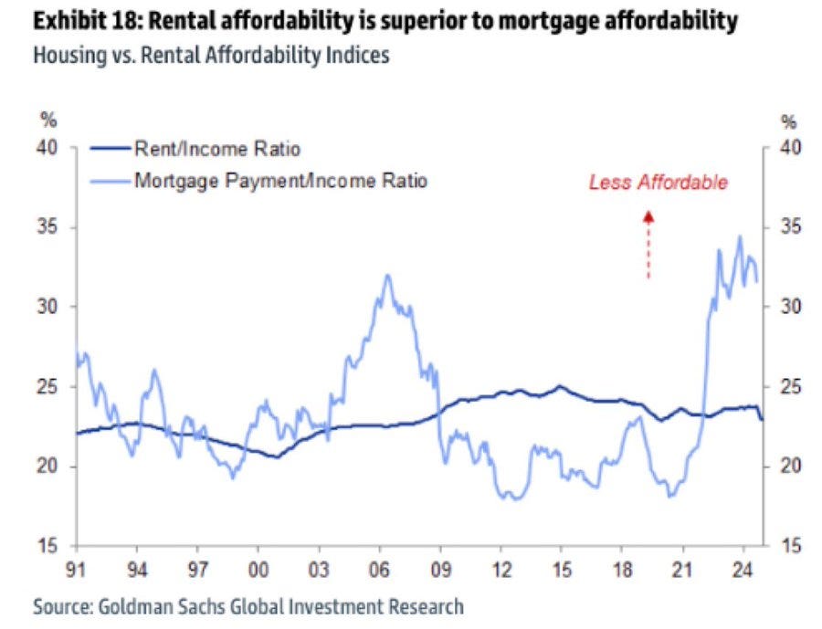 The rent vs buy decision weighs on many individuals. One of the biggest factors in wealth creation is home ownership. Home owner median net worth is $400k, while renter median net worth is $10k. However, today, it is far more affordable to rent vs buy as outlined in the chart below. High prices in recent years coupled with higher rates have made home ownership unattainable for many. The Goldman Sachs chart below suggests that renting is more attractive than buying today by one of the widest gaps ever recorded.
